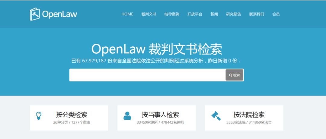 OpenLaw裁判文书检索除了智能检索框外,还提供三种检索方式:按分类检索、按当事人检索、按法院检索。
