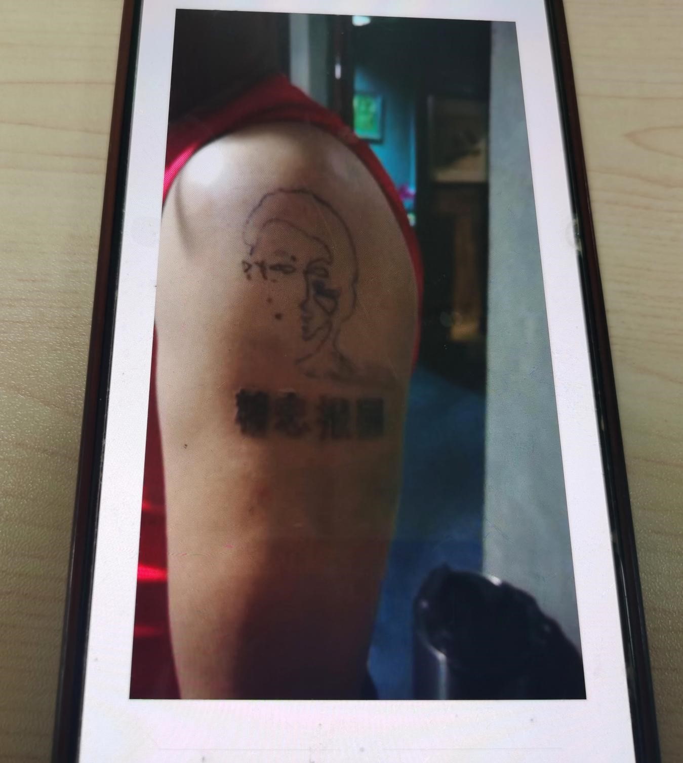 有会员在手臂上纹了“老大”的头像,下方写着“精忠报国”四字。