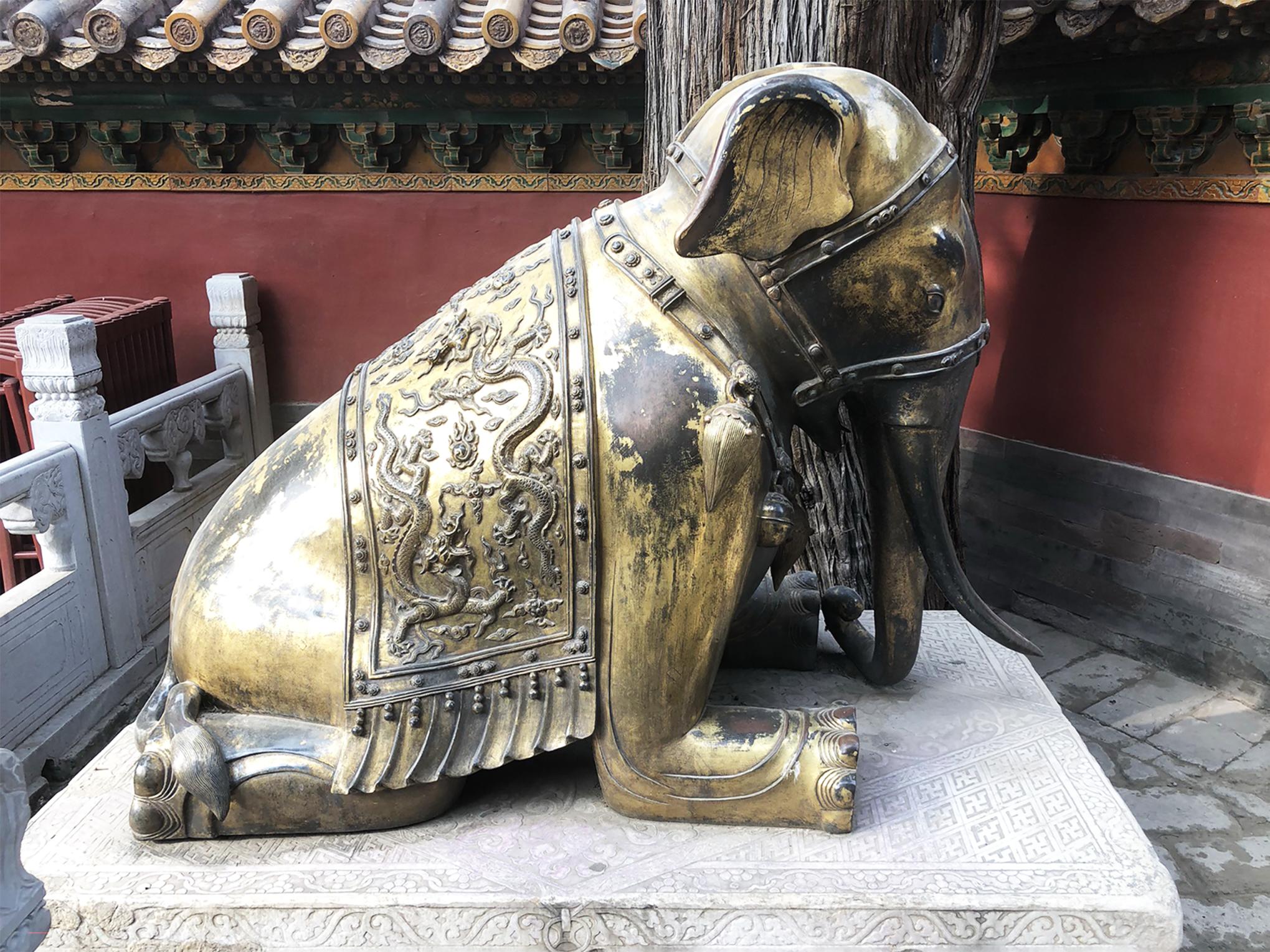 御花园位于故宫中轴线的北部,是宫中四大花园之一,为明清帝后休闲场所。御花园的北门即承光门内,有鎏金铜象一对,分别位于门内东西两侧,相向而设。每头铜象长约1.6米,宽约0.8米,高约1.1米,跪伏在高约0.6米的须弥座上。从造型来看,这对铜象尽管身形健壮,但极显温顺:俯首垂耳,双目下视,尖牙朝下,长鼻收卷。象四足跪地,似乎正在恭迎皇室主人。其头部、背部的装饰造型,与《大清会典图》中宝象的描述相似:头部套络带;胸前系革带,革带上有缨珞和铜铃装饰;背部有供人乘坐的垫子,上绘金龙彩云纹饰。