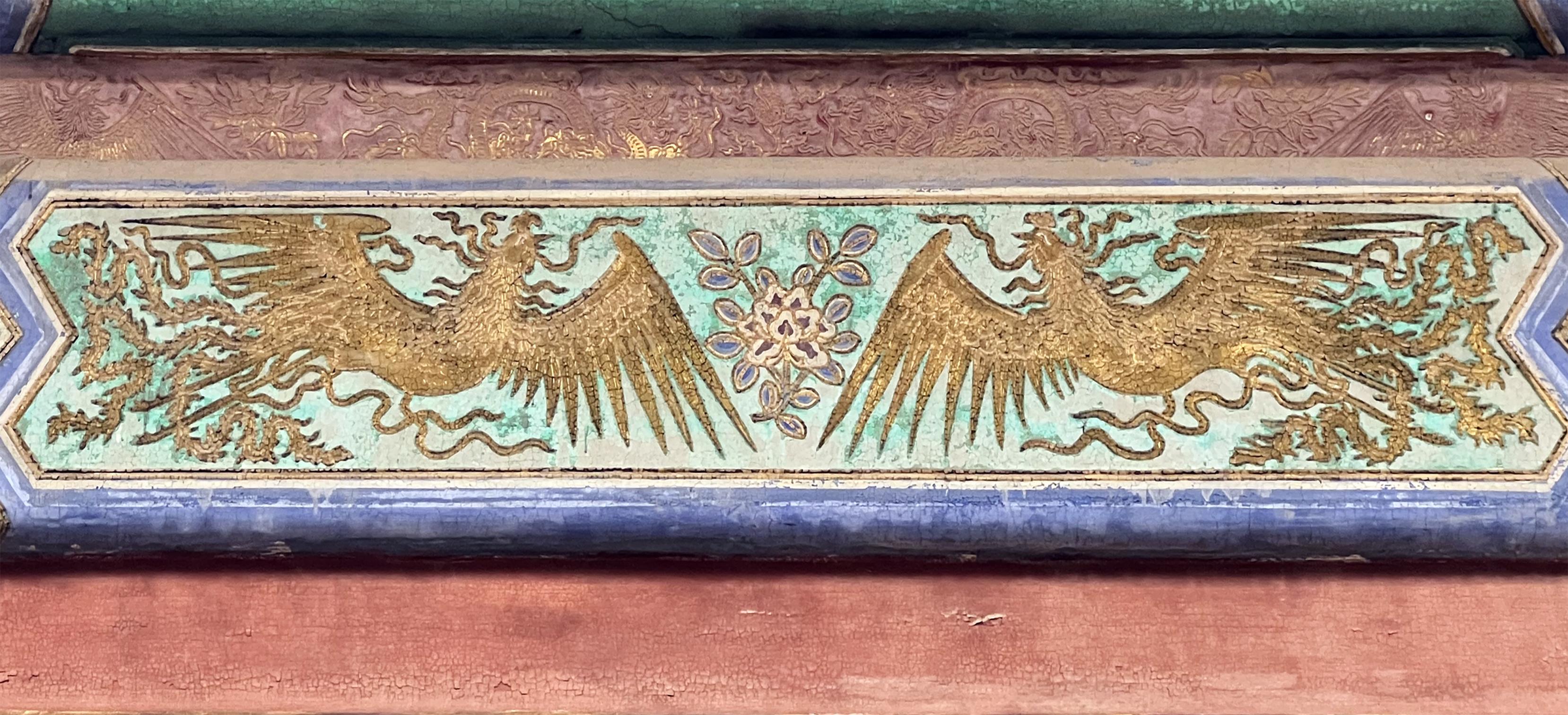 交泰殿位于乾清宫的北面,主要功能为皇后在重要节日接受朝贺的场所。交泰殿的建筑纹饰,除了龙纹外,还大面积用到了凤纹,如隔扇及槛窗装饰、屋檐及室内顶棚彩画、藻井等多个部位均包含凤纹饰。以交泰殿外檐彩画为例,其做法包含了“双凤昭富”图案,画面的两只凤凰以牡丹花为中心,相向翩翩起舞。其造型呈现以下特点:如意冠,锦鸡首,鹦鹉嘴,鸳鸯身,孔雀羽,仙鹤足。这个造型是综合了许多动物的身体部位,并经过艺术加工而成。