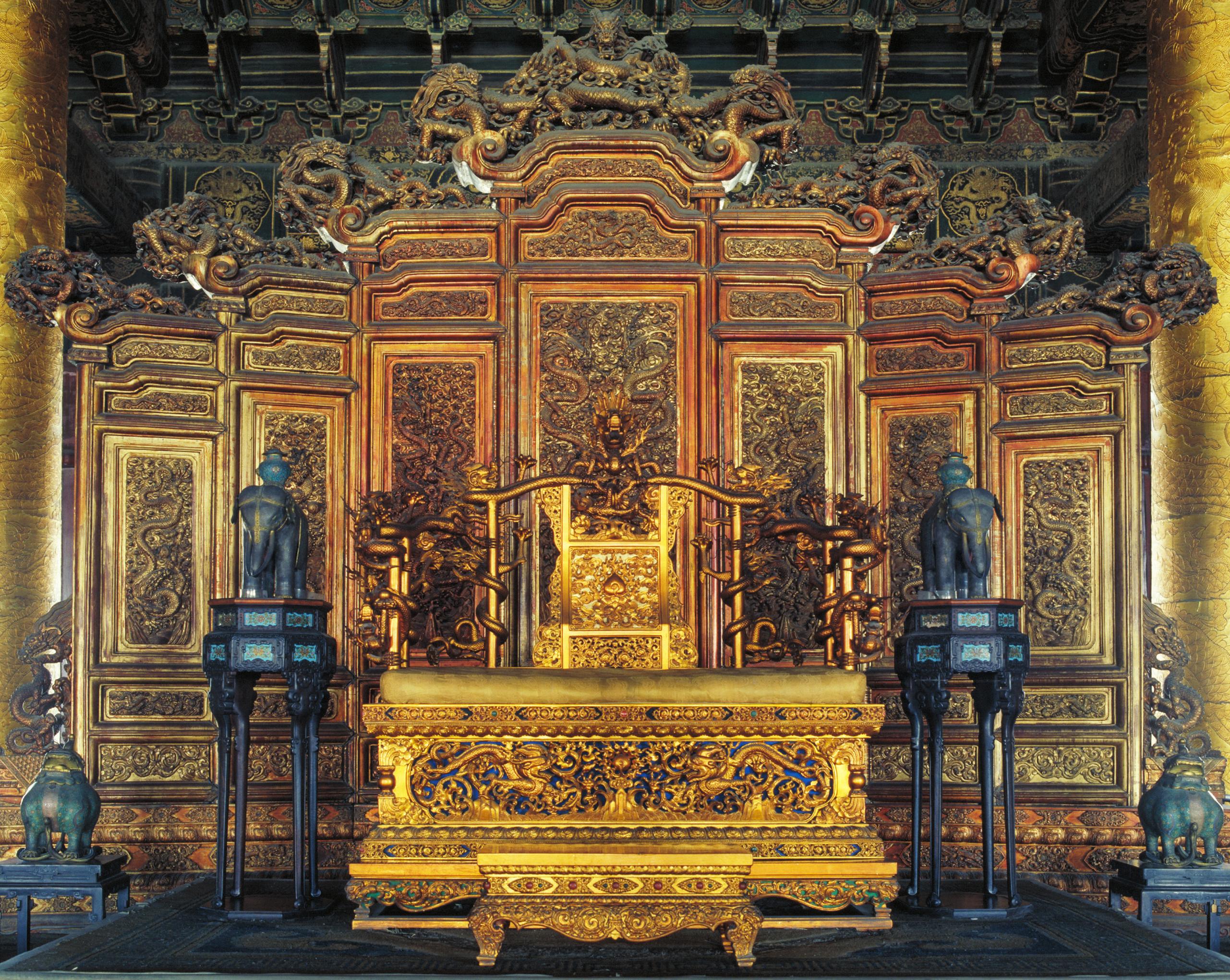 太和殿内雕刻着大量龙图案的宝座和屏风