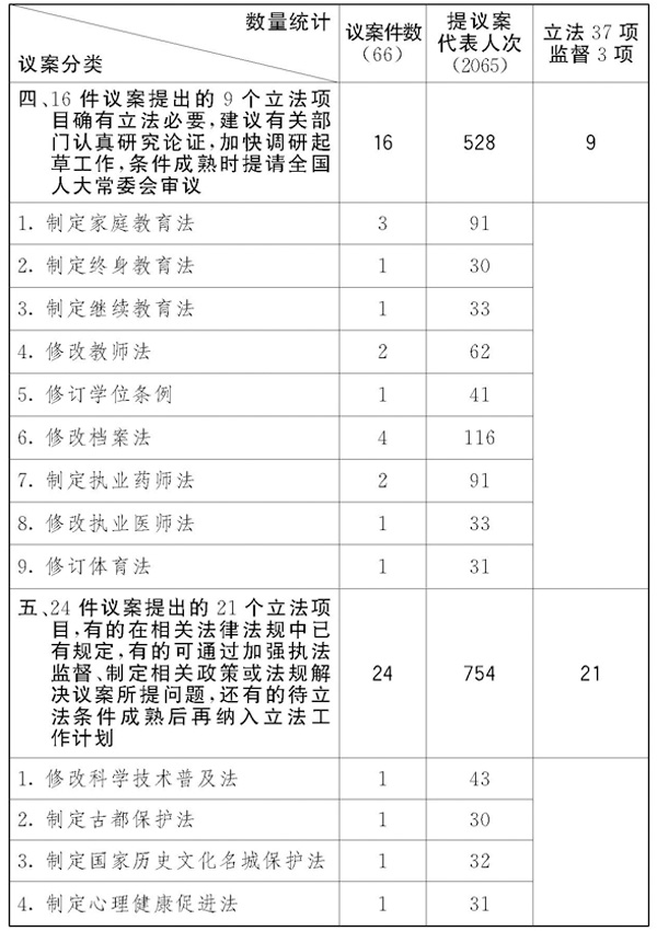 2.关于修改义务教育法的议案3件和关于修改教育法个别条款的议案1件。