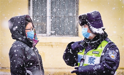 黑龙江哈尔滨市公安局党员突击队队员、交警支队机动大队辅警李可心(右)在为市民讲解疫情防控相关规定。新华社发