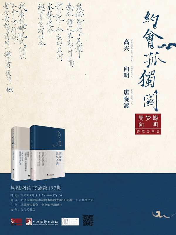 嘉宾:向明(台湾著名诗人)、唐晓渡(文学评论家、诗人)、高兴(《世界文学》主编、翻译家)