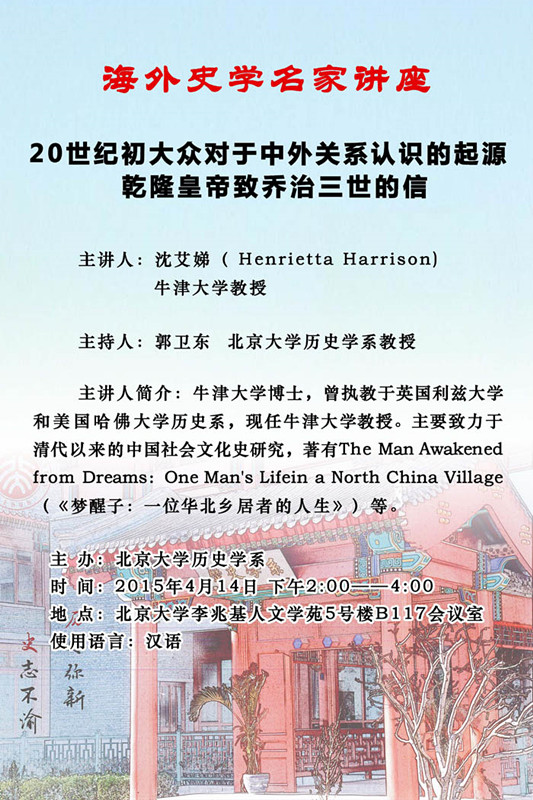沈艾娣曾任教于英国利兹大学、美国哈佛大学历史系,主要致力于清代以来中国社会文化史,代表作有《梦醒子:一位华北村庄士绅的生平,1857—1942》、《制造共和国民:中国的政治仪式与象征,1911—1929》等。讲座她将以乾隆皇帝致乔治三世的信为切入点,谈谈当时人们对中外关系的认识。