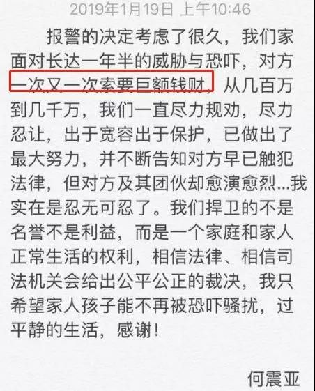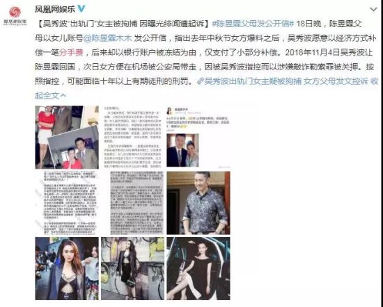 吴秀波指控绯闻女主陈昱霖的理由是敲诈勒索。他老婆何震亚发表声明说,陈昱霖多次向吴秀波要过钱,要的金额还挺大。