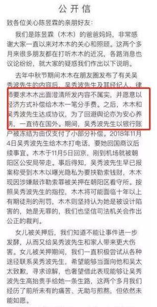 陈昱霖父母给的解释是,钱是吴秀波为了平息绯闻主动给的分手费,还签了协议。只是吴秀波以银行账户被冻结为由只给了小部分,然后打电话给陈昱霖要她回国商量如何处理,结果对方一到机场就被公安局带走了。