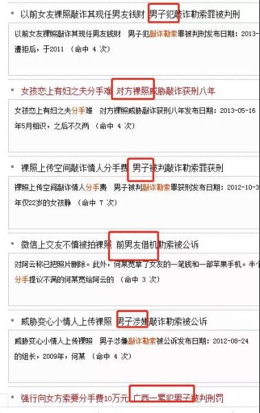 北大法意数据库显示的男方跟女方要分手费的14篇案例中,其中8篇都是男方用恋爱期间拍摄的裸照和xxoo视频威胁女生。
