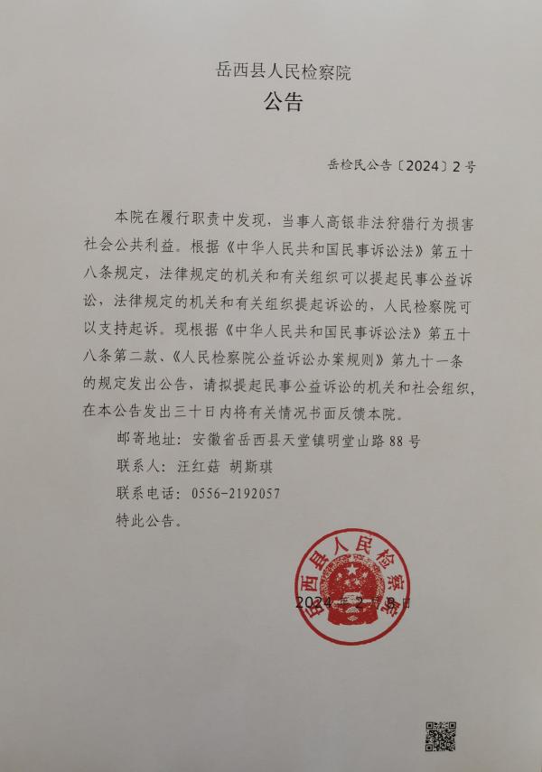 本院在履行职责中发现,当事人高银非法狩猎行为损害社会公共利益。根据《中华人民共和国民事诉讼法》第五十八条规定,法律规定的机关和有关组织可以提起民事公益诉讼,法律规定的机关和有关组织提起诉讼的,人民检察院可以支持起诉。现根据《中华人民共和国民事诉讼法》第五十八条第二款、《人民检察院公益诉讼办案规则》第九十一条的规定发出公告,请拟提起民事公益诉讼的机关和社会组织,在本公告发出三十日内将有关情况书面反馈本院。