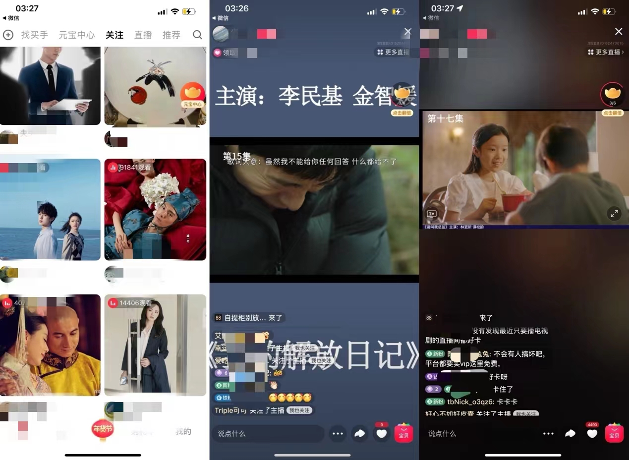 夜已深,仍有大量网友蹲守“追剧”。一个直播间正在播放《芈月传》,显示有47.57万人次观看,在直播间左下方,不少网友正对剧情发表评论。另一个直播间正在播放《请叫我总监》,有8万余人次观看。有网友评论道,“不会有人搞破坏吧,平台都要买vip这里免费看。”