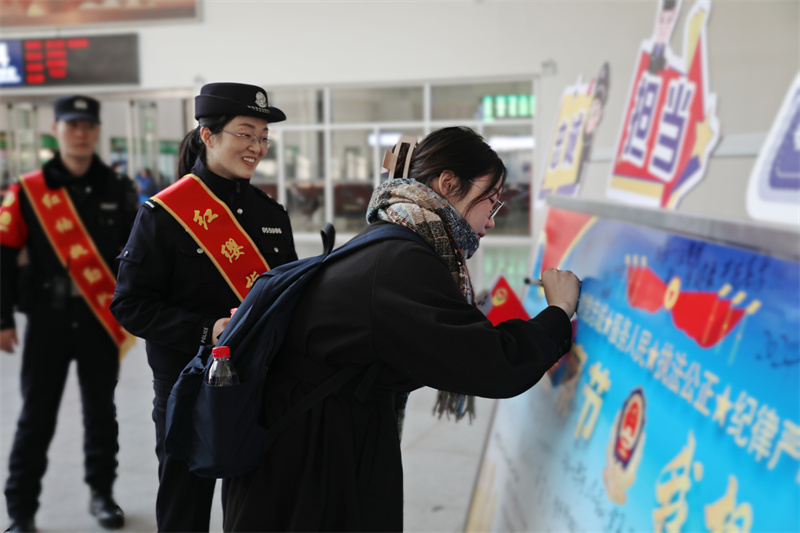 1月10日,郑州铁路公安局洛阳公安处洛阳站派出所民警见证旅客在安全出行提示牌上签名。本报记者 赵红旗 本报通讯员 杨彦平 卫旭阳 摄