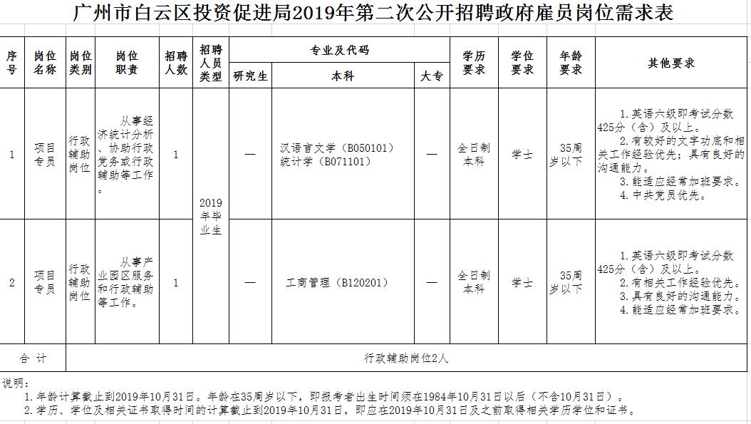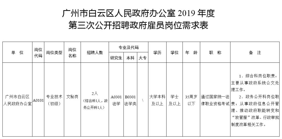 (六)其他具体条件和要求详见《广州市白云区人民政府办公室2019年度公开招聘政府雇员岗位需求表》。