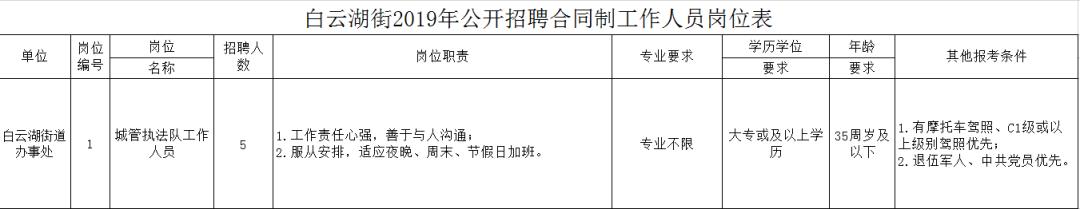 4、学历要求等详见附件《白云湖街2019年公开招聘合同制岗位表》;
