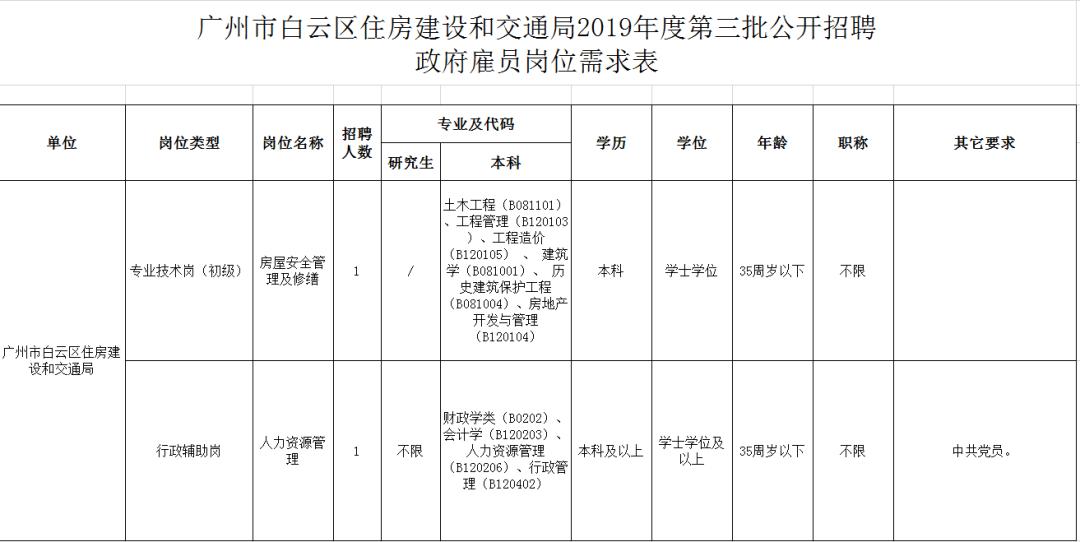 (五)其他具体条件和要求详见《广州市白云区住房建设和交通局2019年度第三批公开招聘政府雇员岗位需求表》。