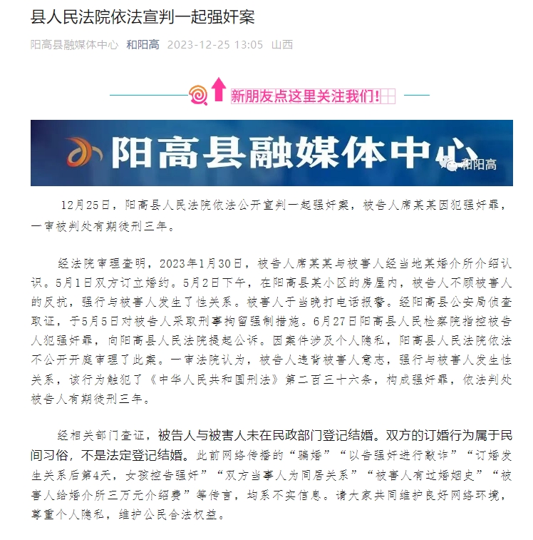 2023年12月25日13时许,阳高县融媒体中心微信公众号“和阳高”通报此案审理情况。通报指出,经法院审理查明,2023年1月30日,被告人与被害人经当地某婚介所介绍认识。5月1日双方订立婚约。5月2日下午,在阳高县某小区的房屋内,被告人不顾被害人反抗,强行与被害人发生了性关系。被害人于当晚打电话报警。经阳高县公安局侦查取证,于5月5日对被告人采取刑事拘留强制措施。经相关部门查证,被告人与被害人未在民政部门登记结婚。双方的订婚行为属于民间习俗,不是法定登记结婚。此前,此前网络传播的“骗婚”“以告强奸进行敲诈”等多个传言,均系不实信息。这一通报初步回应了多个舆论关切点,网民观点开始出现扭转,部分网民指出订婚不等于同意发生性关系。