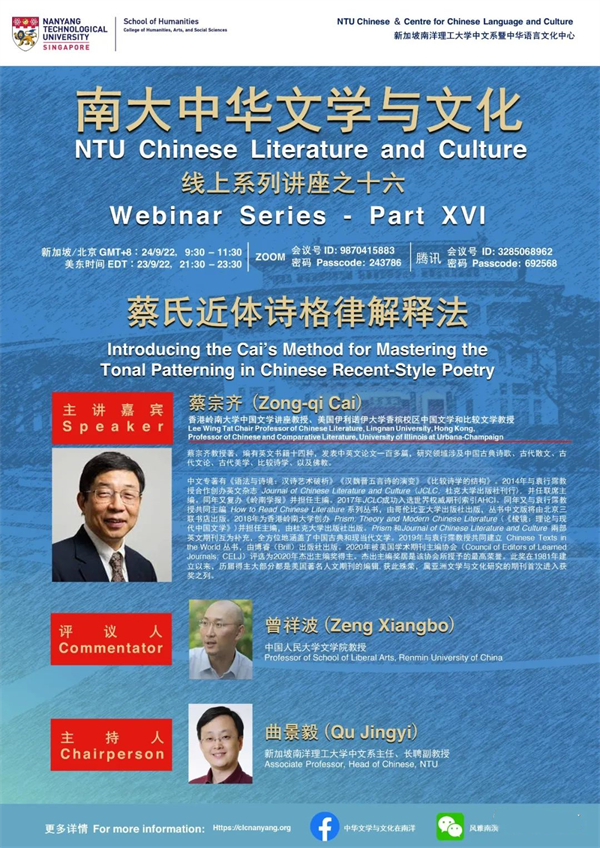 学习掌握近体诗格律,历来很大程度上要靠死记硬背,先记住首句有平起仄起之别,然后记住句末又有不入韵和入韵之别,得出格律四式,最后再看着平仄图表来背诵四式的格律。上世纪八十年代末,讲者在课堂上听到导师高友工先生总结出建构近体律句、律联、律绝、律诗的三项原则,茅塞顿开,发现原来四种格律都可以用分析方法推演出来。在以后的教学实践中,讲者不断对这三项原则加以细化,发现了其他相关规律,并将格律四式简化为两式,从而发展出一个颇为系统的近体诗解释法,运用于美国大学本科的通识课程,效果甚好。讲者认为,较之传统格律四式,此解释法更为精简准确,分析性强,引入中文世界诗歌教学或许也有同样的效果。此法介绍完毕,讲者将从比较莎士比亚十四行诗第十八首和杜甫《春望》入手,探讨中英格式的形式和内容如何折射出两种截然不同的世界观以及思维方式。作为结语,讲者将超越文学话题,畅谈这两种不同世界观如何影响中国现代历史进程乃至当今的国际政治和外交。