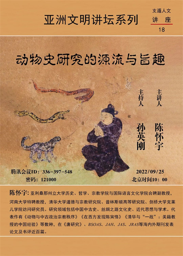 陈怀宇老师的研究领域包括中国中古史、丝绸之路文化史、近代思想与美术,代表作有《动物与中古政治宗教秩序》等。本次讲座,我们邀请他来谈谈动物史研究的源流与旨趣。