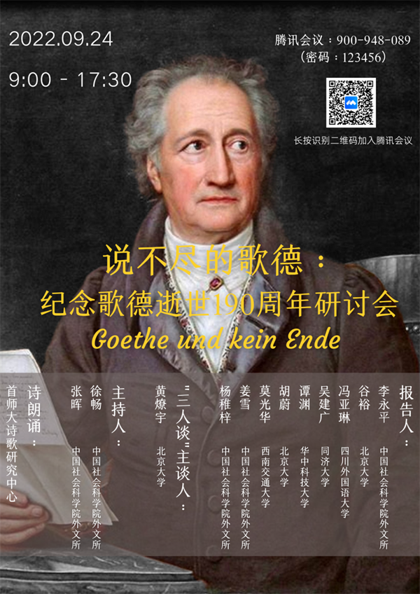 为纪念歌德逝世190周年,中国外国文学学会德语文学分会主办的本次学术研讨会,将邀请多位学者分别以歌德的“人”、歌德晚年组诗、《浮士德》、歌德与中国女诗人“开元”等主题进行探讨。