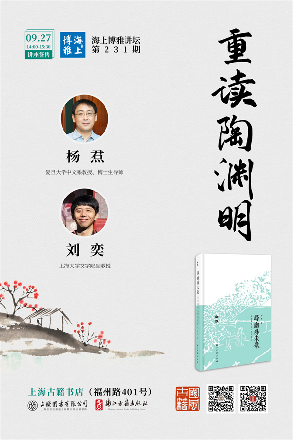 我们真的了解陶渊明吗?陶渊明的诗文平易清浅,似乎无待细究就能理解,但为何偏偏是陶渊明,影响了中国千年来的文学审美?9月27日,复旦大学中文系教授、博士生导师杨焄和上海大学文学院副教授刘奕,将以对谈的形式,结合《寻幽殊未歇:从古典诗文到现代学人》这部学术随笔集,在上海古籍书店举办“重读陶渊明”主题讲座,讲述中古时期特殊文化背景下陶诗平淡背后的深意。