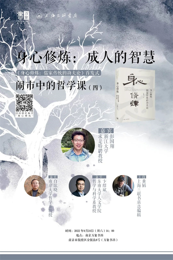 哲学讲的是人与世界的关系。在中国传统中,天人合一,道法自然。中国哲学骨子里就是安身立命的智慧。“闹市中的哲学课”第四期,我们在南京万象书坊讨论身心修炼:成人的智慧。这次活动的主讲嘉宾是浙江大学哲学学院求是特聘教授彭国翔老师,他的新书《身心修炼:儒家传统的功夫论》刚刚出版,南京大学哲学系教授白欲晓、东南大学人文学院哲学与科学系教授卞绍斌、将作为对谈嘉宾,和读者一起交流中国哲学问题。
