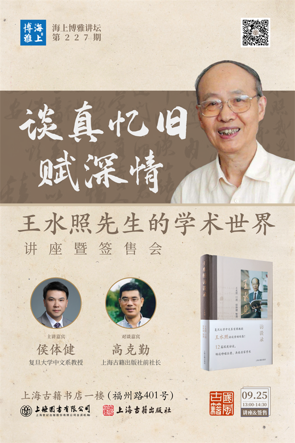 王水照先生是复旦大学中国语言文学系首席教授,著名学者。学界同仁、复旦大学骆玉明教授曾用“三个一”来赞美王水照先生的成就与贡献:所谓“一代之学”,是指他在宋代文学研究中取得的开拓性、典范性成就;“一个方面之学”,是指他在中国文章学方面所做的筚路蓝缕、奠基性工作;“一以贯之之学”,则是对其从未消退的学术热情、从未钝去的学术敏感最好的描述。9月25日,王水照先生的弟子、复旦大学中国语言文学系教授侯体健与上海古籍出版社前社长高克勤,将在上海古籍书店一楼举办讲座暨签售会。活动中,两位嘉宾将以对谈的方式追忆王门问学往事,分享王水照先生的学术历程、学术门径和学术追求,带领读者走近王水照先生的学术世界。