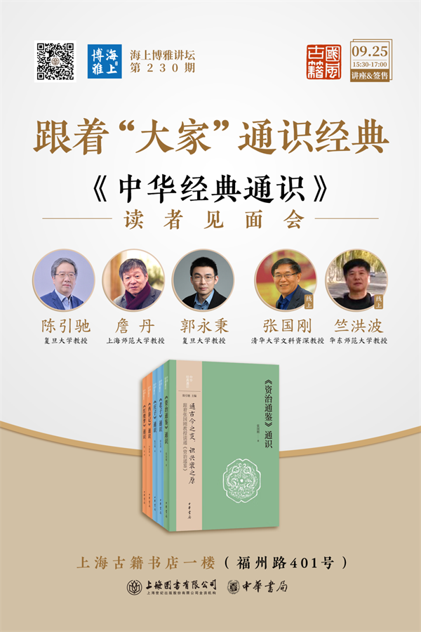 中华传统经典是中华民族的根基和命脉,是我们中国人的必读书。但是,如何快速而准确地了解流传了千年的中华经典,如何一本书读通、读懂一部经典,是普通读者面临的难题。9月25日,复旦大学教授陈引驰、清华大学文科资深教授张国刚、复旦大学教授郭永秉、华东师范大学教授竺洪波、上海师范大学教授詹丹等嘉宾,将在上海古籍书店举办“跟着‘大家’通识经典——《中华经典通识》读者见面会”。活动中,嘉宾将以三位线下、两位线上远程联动的方式,深入浅出地带读者读通《庄子》《资治通鉴》《老子》《西游记》《红楼梦》等中华传统经典。