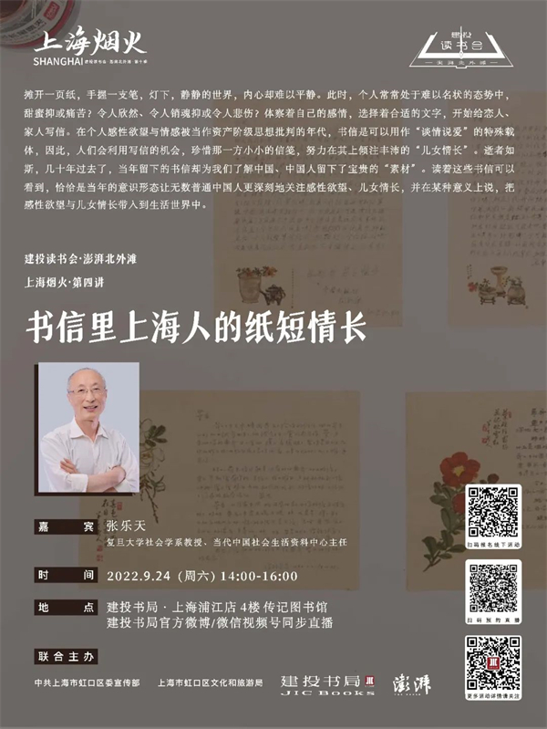 在个人感性欲望与情感被当作资产阶级思想批判的年代,书信是可以用作“谈情说爱”的特殊载体,因此,人们会利用写信的机会,珍惜那一方小小的信笺,努力在其上倾注丰沛的“儿女情长”。9月24日,建投书局邀请到复旦大学张乐天教授,与读者们共同阅读五组“真实”的书信,共同体会书信里上海人的纸短情长。