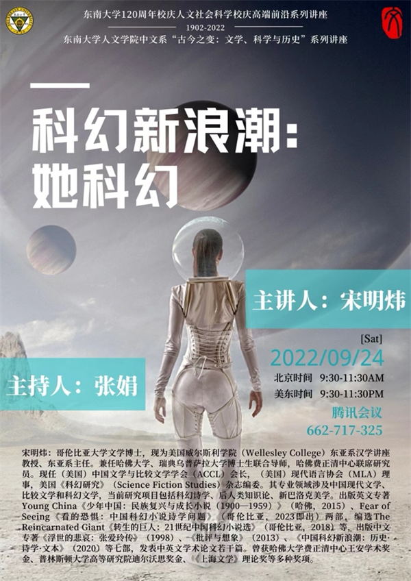 东南大学百廿校庆人文高端系列讲座,本次邀请宋明炜老师为大家主讲科幻新浪潮:她科幻。