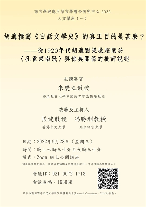 由香港中文大学-北京语言大学汉语语言学与应用语言学联合研究中心主办的人文讲座系列,本期邀请朱庆之教授从1920年代胡适对梁启超关于《孔雀东南飞》与佛典关系的批评说起,谈谈胡适撰写《白话文学史》的真正目的是什么。