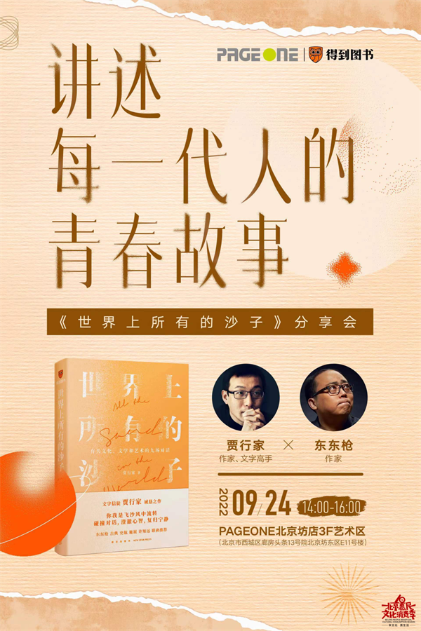 新书《世界上所有的沙子》用杂文的形态构建九场有关历史、文化、社会、文学和艺术的对话。本周六,东东枪和本书作者贾行家准备与各位来客交流:60后、70后、80后、90后、00后,都有什么样的青春故事?那些故事在书页上讲述,在荧屏和银幕上显影,在收音机磁带和播放器里播放时,呈现出了什么色彩?你又会为我们带来自己的什么故事呢?