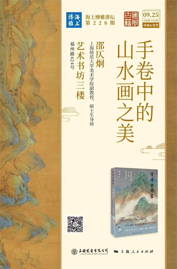 9月25日,艺术书坊将举办“手卷中的山水画之美”主题讲座。讲座中,上海师范大学美术学院副教授、硕士生导师邵仄炯将以山水画手卷欣赏为主题,围绕力作《读懂中国画:画家眼中的五十幅传世名作》,通过不同的视角,结合自身的创作经验,带领读者体会历代山水画手卷的艺术叙事。