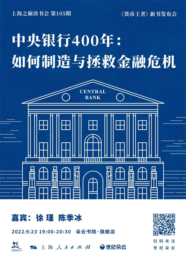 现代金融的主角是中央银行。400年来,各国的中央银行从无到有,由弱到强。在《货币王者》一书中,青年学者徐瑾立足于金融常识,通过一系列财经事件和人物,描绘了17世纪以来的中央银行和经济发展的交融互动。9月23日晚,知名青年学者徐瑾与资深媒体人陈季冰将来到朵云书院·旗舰店,从全球经济面临诸多挑战的当下境况出发,结合《货币王者》一书,深入解读金融危机、经济变迁等话题。