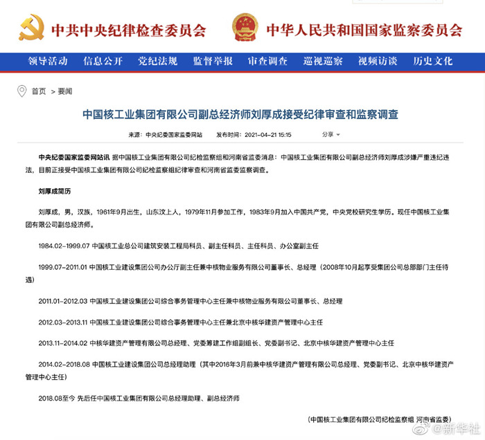 ■中国核工业集团有限公司副总经济师刘厚成接受纪律审查和监察调查