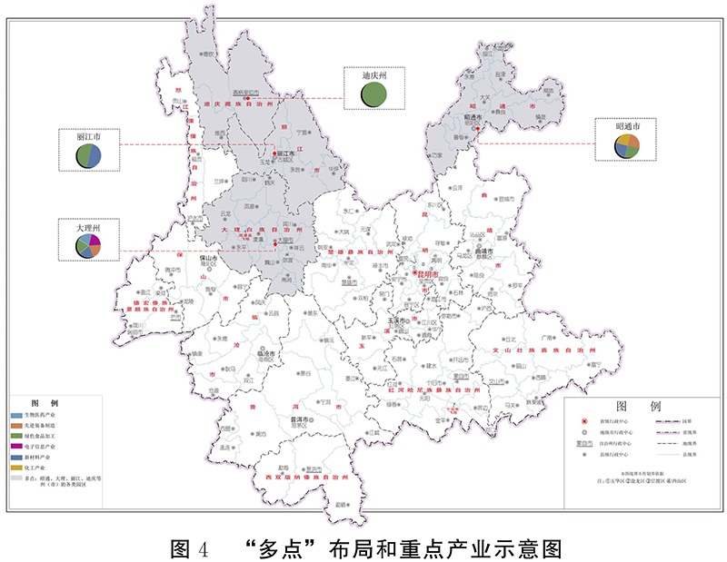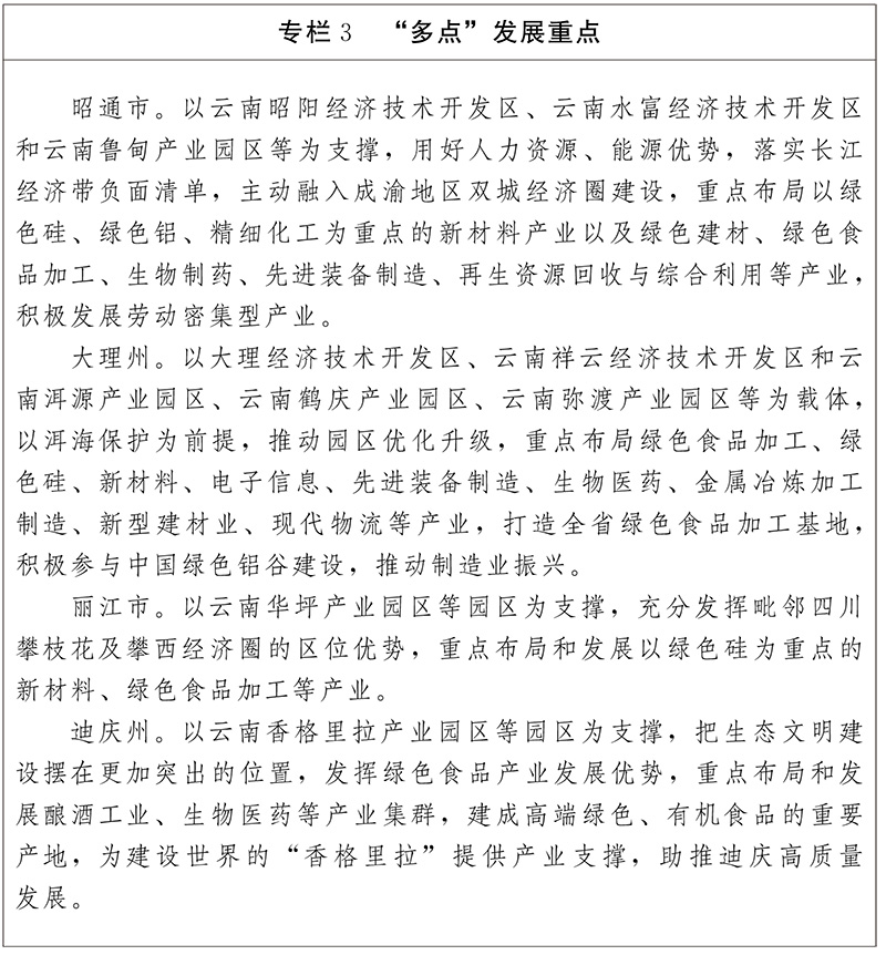 以昭通、大理、丽江、迪庆等州、市园区为支撑,结合地区特色,充分发挥比较优势,围绕以绿色硅、绿色铝为重点的新材料产业以及生物医药、化工、绿色食品加工、电子信息等产业,推动产业集群化、规模化发展,打造特色产业集群,建设全省工业发展重要支撑点。