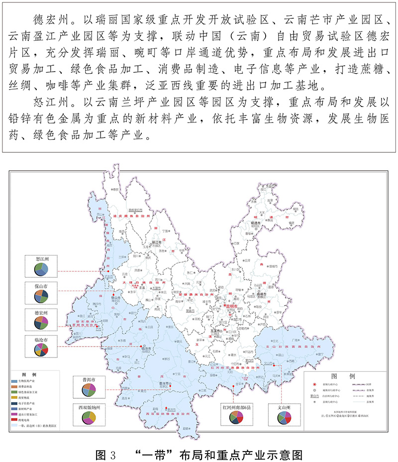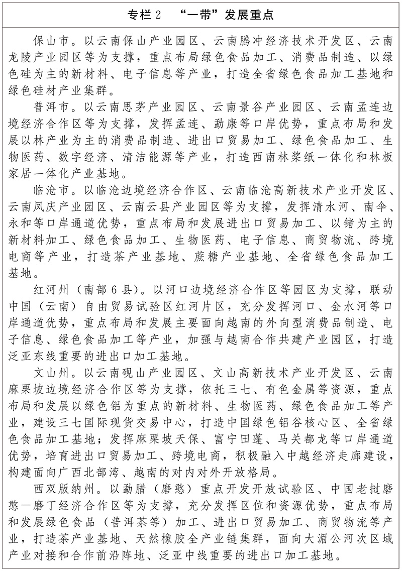 依托8个沿边州、市(保山市、普洱市、临沧市、红河州南部6县、文山州、西双版纳州、德宏州、怒江州)园区,推动产业集聚发展,构建全省开发开放发展带。主动融入新发展格局,利用好国内国际两个市场、两种资源,强化招商引资和对外开放,积极发展进出口贸易加工、消费品制造、商贸物流、跨境电商等外向型产业,推动园区绿色发展,打造沿边开放的重要平台和面向南亚东南亚辐射中心建设的重要支撑,助推沿边开放。