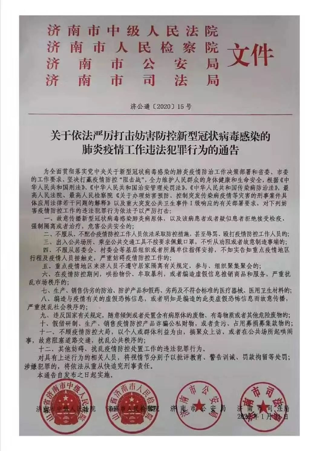 当前,在以习近平同志为核心的党中央坚强领导下,举国上下正在全力应对新型冠状病毒感染的肺炎疫情,坚决打赢这场疫情防控阻击战。1月24日,山东省在全国较早启动重大突发公共卫生事件Ⅰ级响应。疫情就是命令,防控就是责任,济南市司法局迅速行动,及时成立疫情防控领导小组和工作专班,对全市司法行政系统疫情防控工作作出周密部署,牢牢筑起司法行政系统的疫情防护网。济南市司法局、市律师协会主动履行法律服务职能,成立“新冠肺炎疫情防控专项法律服务团”,认真开展疫情防控专项法律宣传和法律服务,专门组织力量整理有关疫情防控法律知识,分传染病防治、刑事和治安管理、稳定物价和保障民生、劳动保障、民商事等五个类别,以问答形式编辑成册,便于广大群众和一线防控人员了解掌握疫情防控有关知识及法律责任、法律依据,从而更好地理解、支持和落实好各级政府和有关部门采取的应急防控措施,履行好自己的权利义务、防控职责,确保全市疫情防控工作依法有序开展。鉴于时间紧张、编者水平有限,本宣传册难免有不当之处,敬请广大读者谅解。