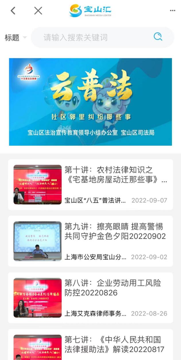 “云普法”平台起源于“法治带头人”“法治明白人”培训工程,受疫情影响,“两人”培训由线下实地转为线上腾讯会议室,但是由于线上会议室容纳人数有限,无法完全满足全区4000名“法治带头人”“法治明白人”培训需求,于是宝山区司法局与宝山区融媒体联合策划在“宝山汇”app推出“云普法”栏目,宝山区线上线下普法课程都能在该栏目播出。迄今为止,宝山区“两人”培训课程,“百所联百会”培训和“法治红船”普法课堂等法治课都在“云普法”栏目中呈现。课程面向青少年、中老年、律师、企业经营管理人员等不同群体,内容涵盖社区邻里侵权纠纷、公证、家庭教育与儿童保护、房产交易税收、打击整治养老诈骗、法律援助、企业劳动用工、宅基地房屋动迁等。每一位主讲人都是宝山区“八五”普法讲师团成员,权威大咖为您准备了专业解读,只等您来!