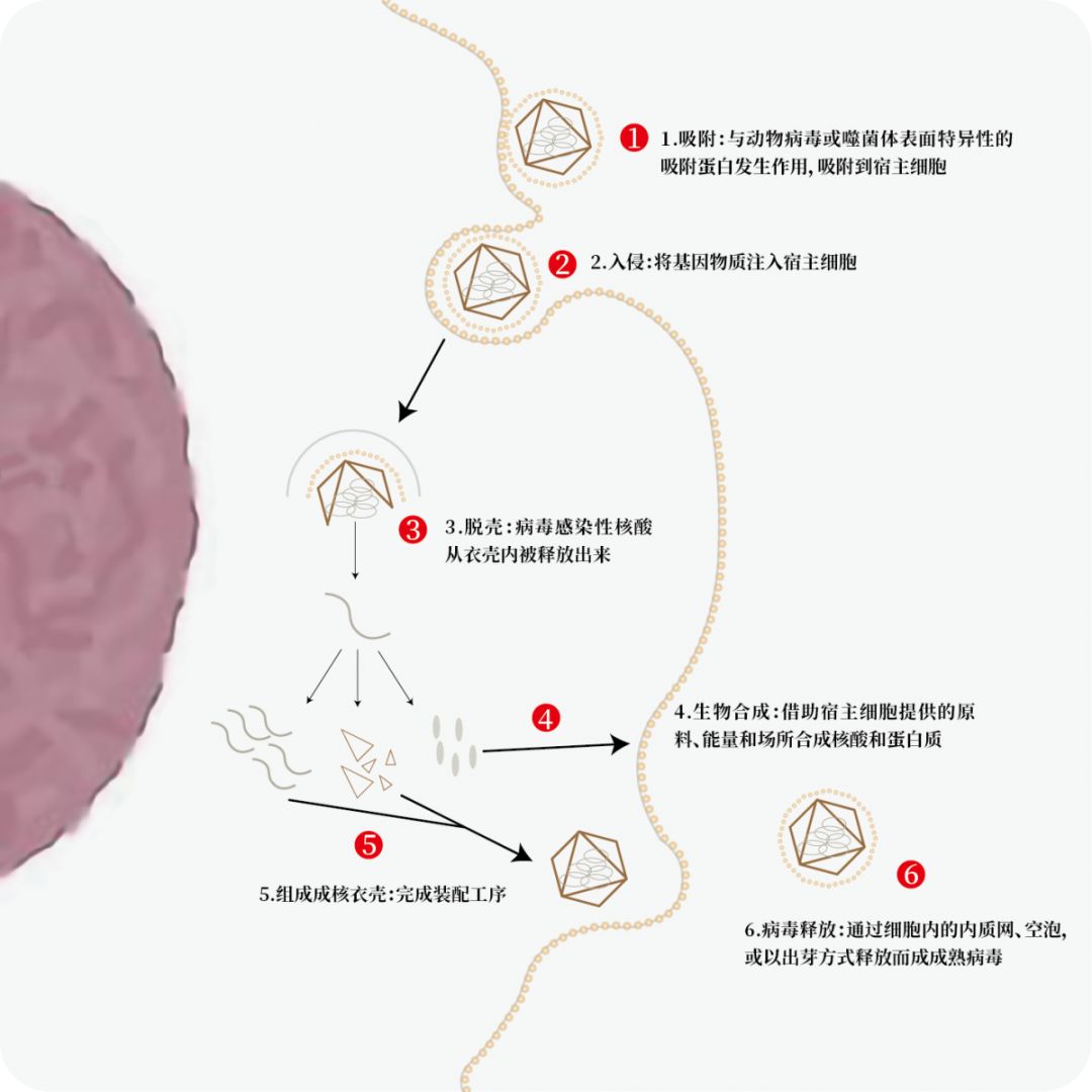 病毒侵入细胞,完成自己的遗传物质和壳粒蛋白复制,算是一个完整的过程。这个过程总共分为六步,像是工厂上的生产线一样。