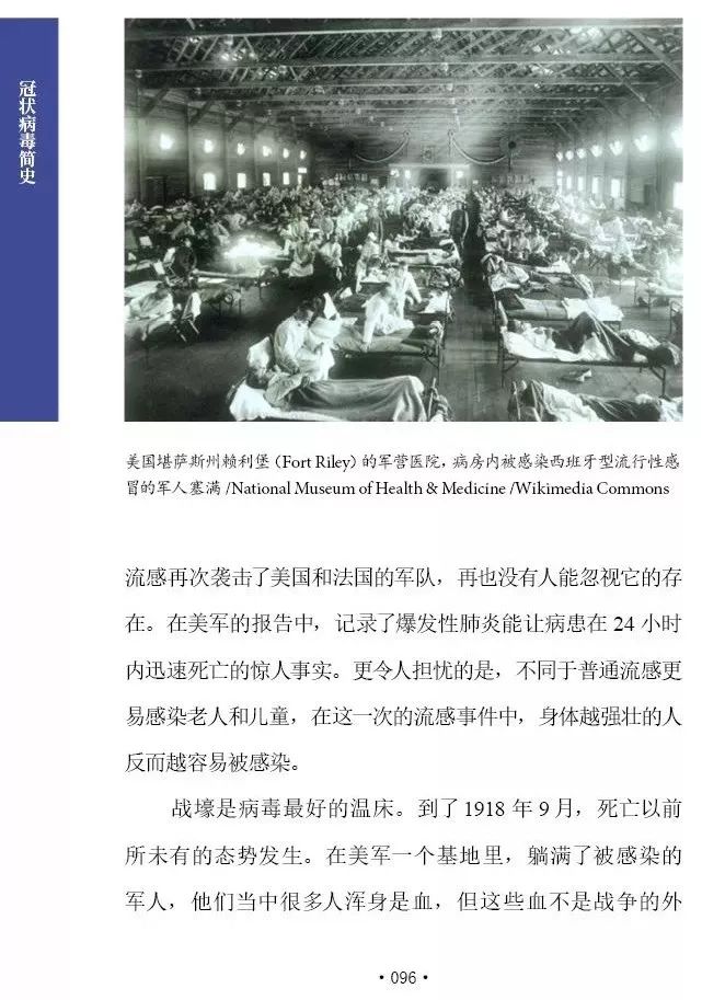 美国堪萨斯州赖利堡(Fort Riley)的军营医院,病房内被感染西班牙型流行性感冒的军人塞满(来源《冠状病毒简史》)
