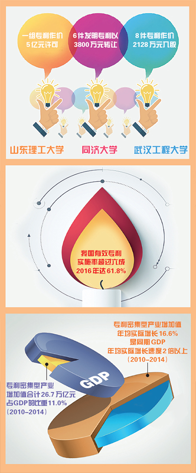 今年3月,山东理工大学毕玉遂教授团队一组专利以5亿元的价格许可给有关企业实施;5月,同济大学王占山教授团队的6件发明专利以3800万元转让;同样在今年,武汉工程大学8件专利作价2128万元入股一公司……多所高校实现专利高价值转移转化,正源于创新的权益分配机制激发了专利运用积极性。