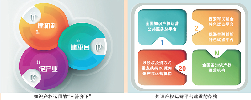 目前,北京全国知识产权运营公共服务总平台、西安军民融合特色试点平台和珠海金融创新特色试点平台均已建成并投入运行,同时还引导10个省份设立了重点产业知识产权运营基金,首期募集资金超过40亿元,支持4个省份设立知识产权质押融资风险补偿基金,有效促进了知识产权与创新资源、产业发展、金融资本的有机融合。