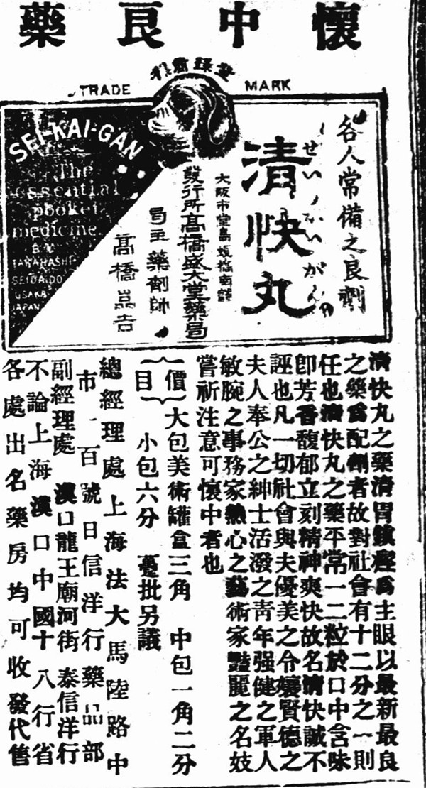 除了迎和中国人的口味与经济购买能力,清快丸的广告也针对中国人消费心理下了一番功夫。最初打入中国市场时,广告极力强调自己是居家旅行必备佳品:“凡一切社会于夫,优美之令娘,贤德之夫人,奉公之绅士,活泼之青年,强健之军人,敏腕之事物家,热心之艺术家,艳丽之名妓,常祈注意,可怀中者。”在对中国社会三教九流夸赞一番后,广告重点强调了清快丸方便携带的特点。