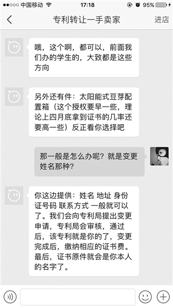在一家机构网店上,北青报记者看到,曾经购买过“实用新型专利申请或转让”的卖家评价称,“感觉很方便,不用自己一个人绞尽脑汁熬夜了,服务为自己省了很多力,果然人多力量大,相信最后能拿到证书。”