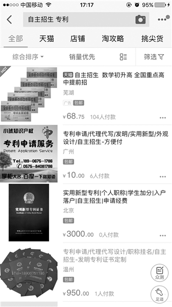 市场需求使得部分专利代理公司打起了高中学生群体的主意。北青报记者在淘宝网上以“自主招生专利”为关键词进行搜索,发现有多家知识产权服务机构的网店写明可以提供“专利申请”、“专利转让”等服务,并注明专利是“自主招生考试通行证”。
