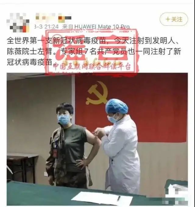 近日,一张配文为“疫苗第一针,院士先试”的图片出现在社交网络上。该配文声称,“第一支新冠病毒疫苗,今天注射到发明人陈薇院士左臂。专家组7名党员也一同注射。”