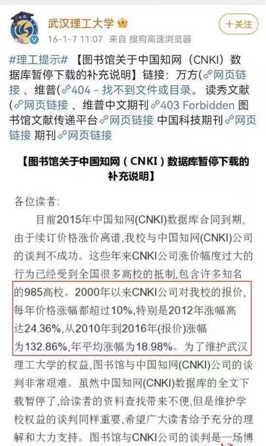 公开资料显示,2016年,武汉理工大学图书馆公告称,由于续订价格“涨价离谱”,与知网的谈判不成功,相关服务暂时停用。其数据显示,2010年到2016年的报价涨幅为132.86%。2016年3月31日,北京大学图书馆也曾发布通知称即将停用知网,理由是“数据库商涨价过高”。不过,公告一段时间过后,这些学校还是续用了知网。