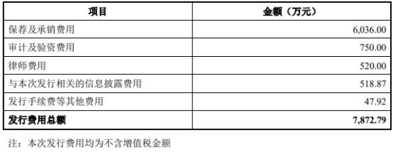 金博股份发行费用总额为7,872.79万元,其中,保荐及承销费用为6,036.00万元。